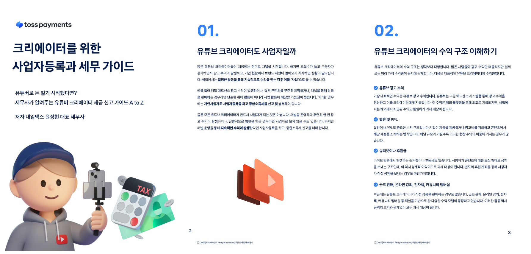 이번 가이드에서는 유튜브 광고 수익과 협찬·후원 수익의 과세 기준을 비롯해, 사업자등록 시점, 절세를 위한 핵심 포인트, 그리고 업종 코드 선택과 부가가치세, 종합소득세 신고까지 크리에이터가 꼭 알아야 할 세무 정보를 한 번에 정리해드립니다.