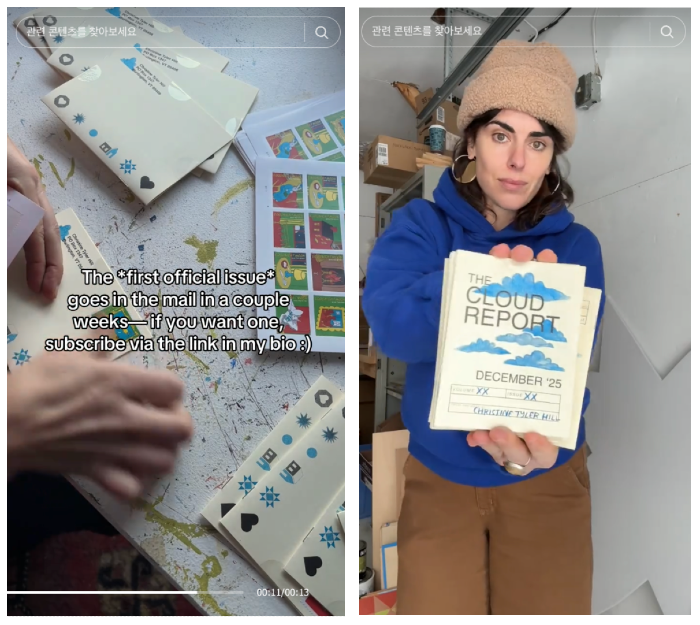 그녀는 기존에 소셜 미디어에 올리던 일상의 기록들을 인쇄된 8페이지짜리 미니 잡지 형태로 만들었고, 이를 The Cloud Report구독자에게 월 1회 우편으로 보내주었어요. 일상의 관찰이 콘텐츠가 되고, 콘텐츠가 사업이 된 순간이었습니다.