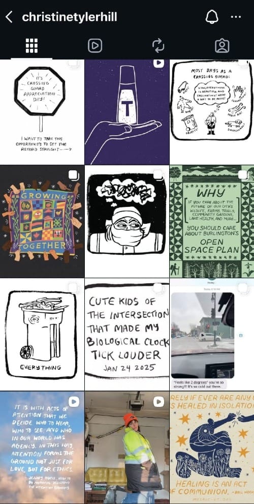 매일 아침 7시 30분, 그녀는 미국 버몬트주 벌링턴의 한 교차로에 섭니다. 50분짜리 짧은 근무에서 하는 일이라고는 아이들이 안전하게 길을 건널 수 있도록 돕는 것 뿐이었죠. 그러나 크리스틴은 이 시간을 그냥 흘려보내지 않았습니다. 지나가는 사람들의 표정, 계절의 변화, 하늘 위 구름의 모양까지 교차로에서 보이는 모든 것을 기록했고, 2023년 말부터 소셜미디어에 꾸준히 올렸어요.