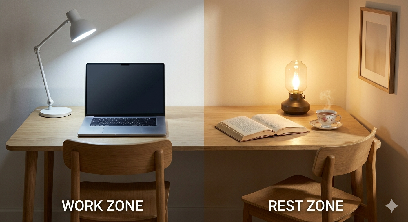 * 조명의 변화: 일할 때는 차가운 색 스탠드를, 쉴 때는 따뜻한 색 무드등을 켜보세요.