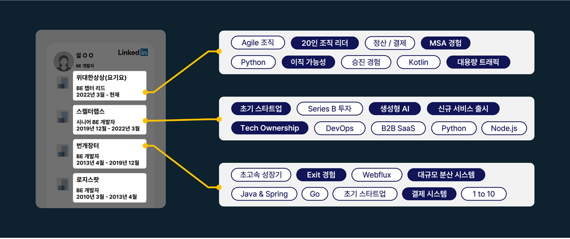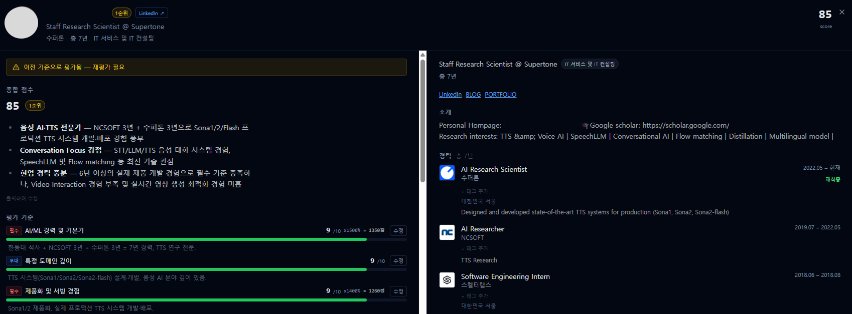 JD를 구조화된 평가 기준으로 전환하고, 빈약한 프로필 정보를 외부 데이터로 보강함으로써 적합도 판단의 근거를 '사람의 감'이 아닌 'AI의 논리'로 대체합니다.