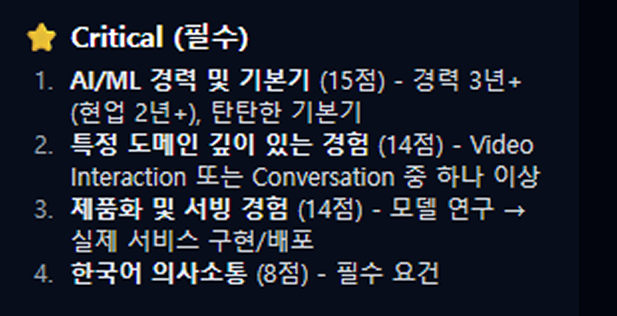 루피는 먼저 Critical(총 51점) 영역을 통해 후보자의 '기본 자격'을 검증합니다. 아래 조건 중 하나라도 미달할 경우, 전체 점수와 관계없이 적합 후보군에서 제외하거나 경고 태그를 부여합니다.