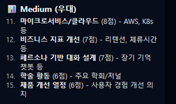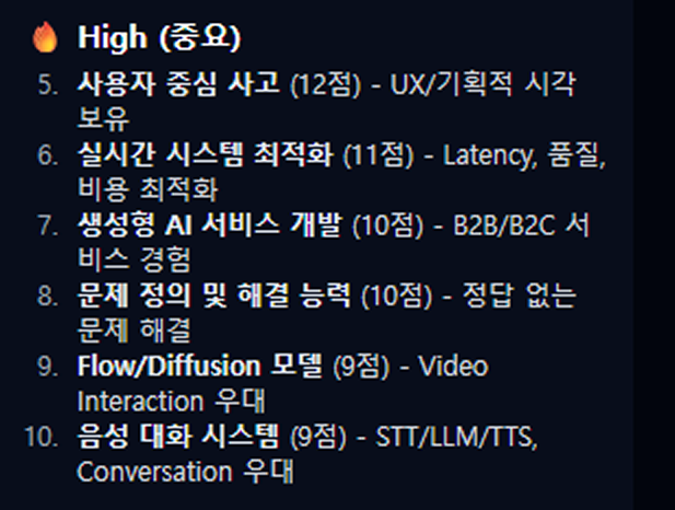 루피는 직무기술서를 분석하여 총 15개의 세부 지표를 도출하고, 이를 Critical(필수), High(우선), Medium(우대)의 3단계 가중치 체계로 구조화합니다.