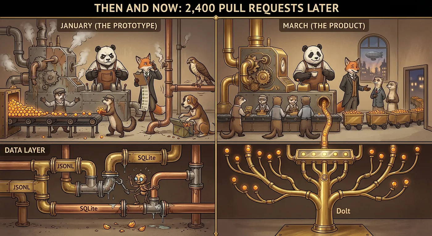 그래서 최근 전면 교체를 진행했어요. 제가 진짜 필요했던 건 "Git처럼 변경 이력이 남는 데이터베이스"였는데, 이미 누군가 이걸 풀어놨더라고요. Dolt라는 팀이에요. 알고 보니 아마존 시절 동료였던 팀 센(Tim Sehn)이 만든 거예요. Dolt로 바꾸면 복잡한 동기화 구조가 전부 사라지고, 충돌도 훨씬 깔끔하게 해결돼요. 코드 한 줄이면 Beads에 붙일 수 있습니다.