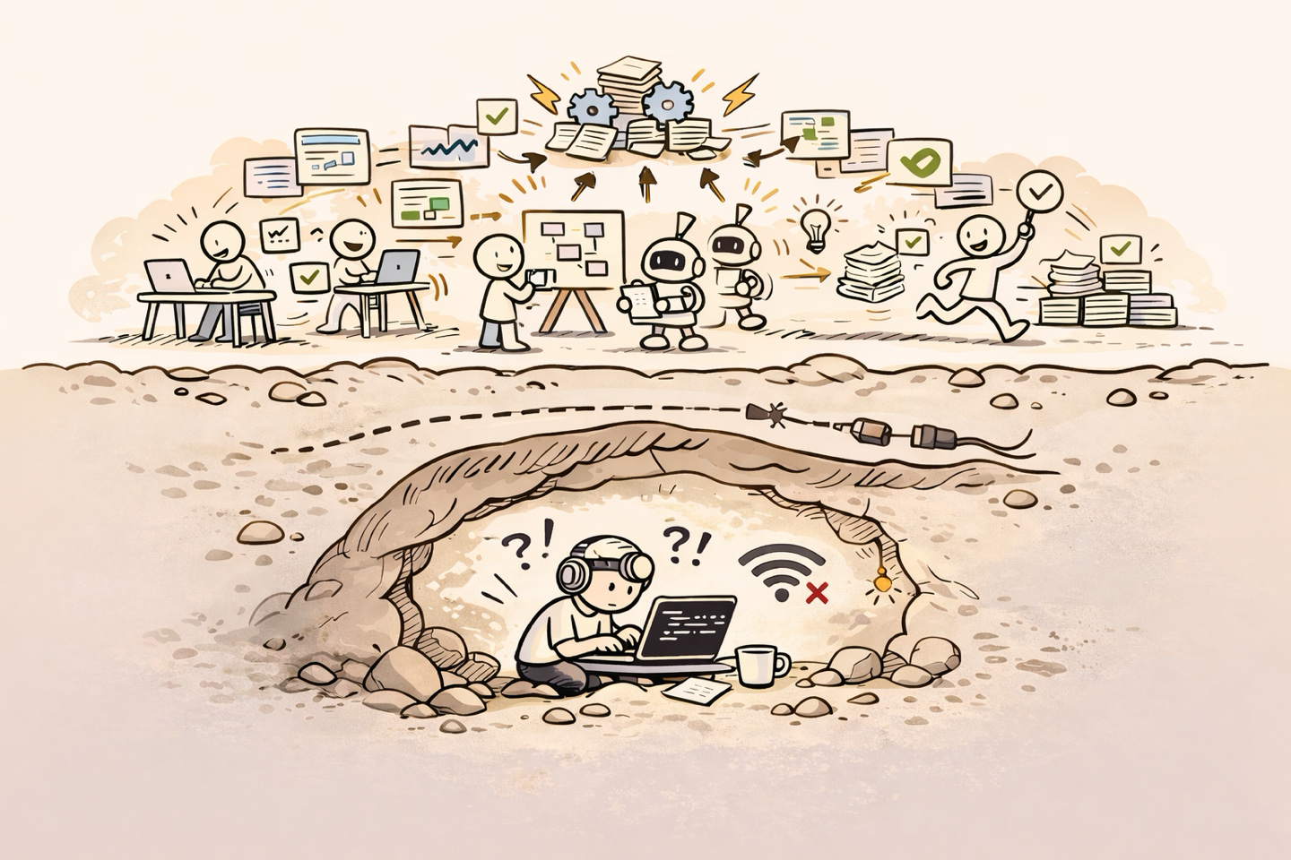 에이전트 20개를 돌리면 속도가 워낙 빨라서, 작업을 잠깐이라도 공유하지 않으면 광산 밑에서 혼자 일하는 꼴이에요. 세상이 순식간에 지나가버리고, 그 사이에 만든 코드는 이미 바뀌어버린 코드 위에 얹을 수가 없거든요.