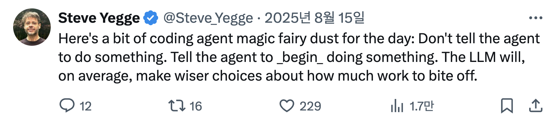 그 모드에서 벗어나니까 세계가 바뀌더라고요. 에이전트도 실수해요. 사람 엔지니어처럼요. 그러니 스트레스 받지 말고, 끝난 결과만 보면 돼요. 끝난 에이전트는 둘 중 하나예요. 스스로는 끝났다고 하지만 실제로는 덜 된 경우, 아니면 진짜 끝나서 "다음에 뭘 할까요?"라고 묻는 경우.