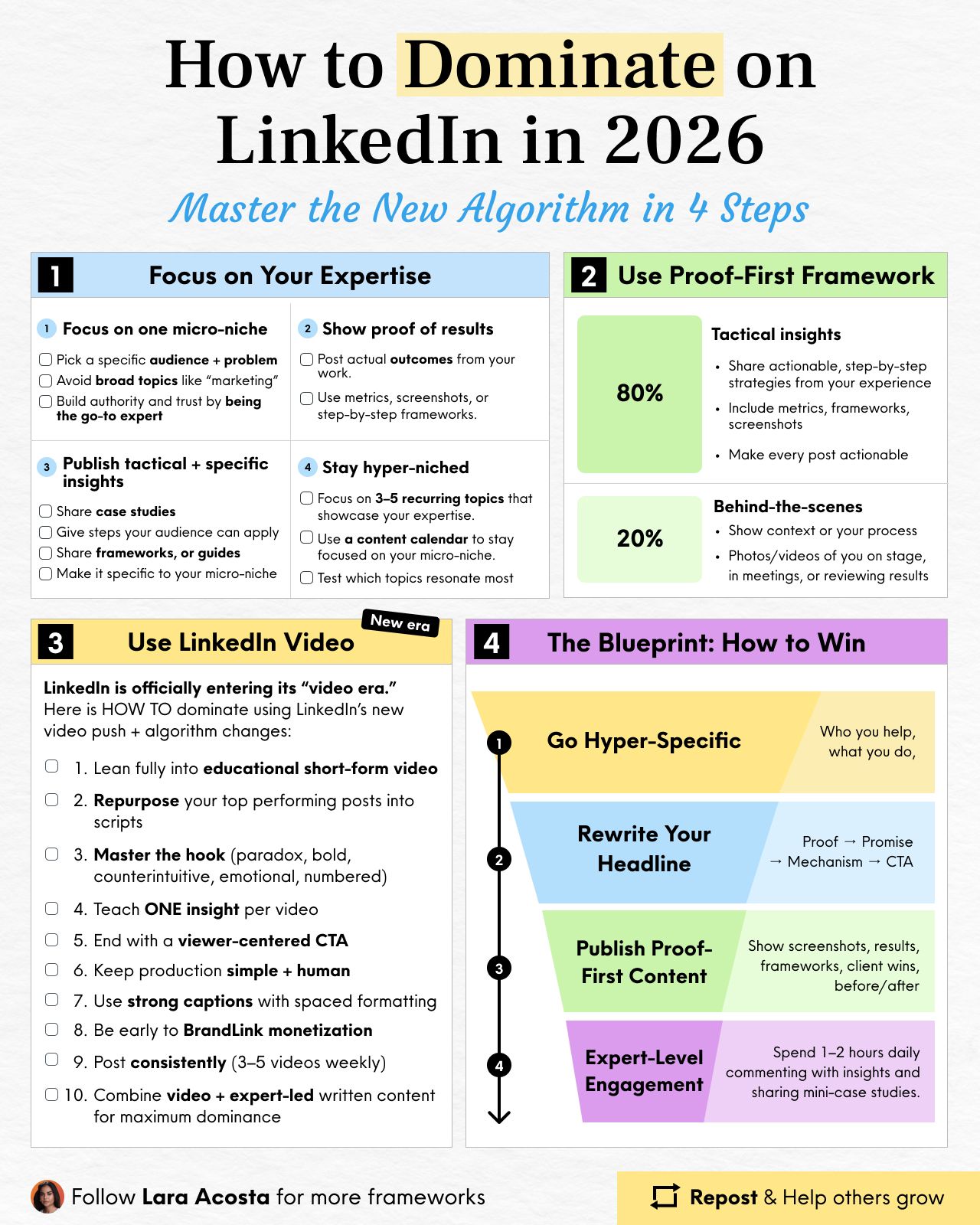 인스타그램, 틱톡, 유튜브, 링크드인을 동시에 잘 하는 건 불가능에 가깝습니다. 한 플랫폼에서 깊이 파고드는 것이 모든 곳에서 얕게 하는 것보다 훨씬 강력합니다. 라라는 링크드인 하나에만 집중해서 30만 팔로워와 세 개의 사업을 만들었습니다.