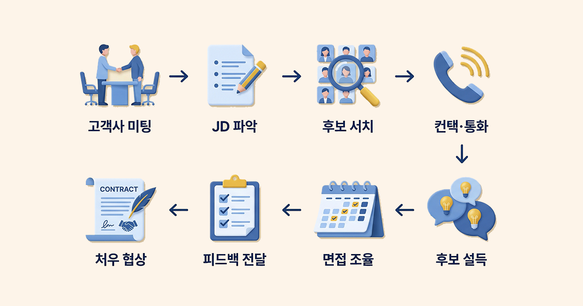 고객사 미팅 → JD 파악 및 요건 정의 → 후보 서치 → 수십 명 컨택·통화 → 후보 설득 → 면접 스케줄 조율 → 면접 후 고객사 피드백 전달 → 합격 시 처우 협상 조율
