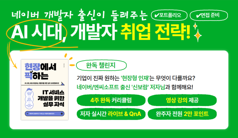 [수강 전 참고 사항] 학습 자료 (별도 구매 필수) <현장에서 픽하는 IT 서비스 개발을 위한 실무 지식> (길벗, 2026) 교보문고: https://product.kyobobook.co.kr/detail/S000219545209 YES24: https://www.yes24.com/product/goods/183754087 알라딘: https://www.aladin.co.kr/shop/wproduct.aspx?ItemId=388859916 |