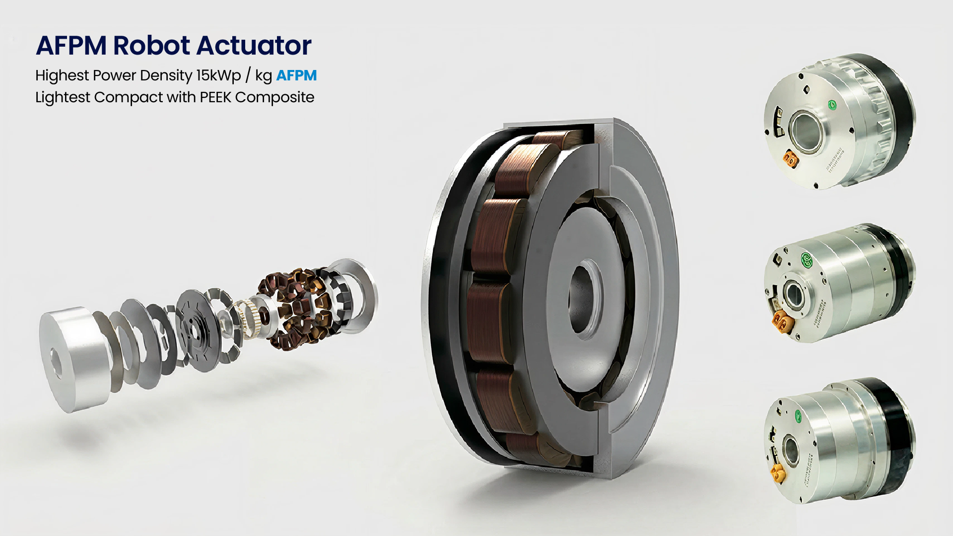 최근에는 휴머노이드 분야에서도 연락을 받고 있습니다. 휴머노이드가 사람처럼 움직이기 위해서 모터가 많이 들어가는데, 현재는 전체 무게의 60%가 모터 무게라는 거예요. 휴머노이드가 더 완성형이 되기 위해서는 사람 몸무게랑 비슷해져야 하고 결국에는 모터 무게를 줄여야 하는 거죠. 그래서 작고 가벼우면서 힘이 센 AFPM 모터의 특성을 알게 된 국내 대기업 2곳에서 휴머노이드용 액츄에이터 개발 요청을 받았고, 미국, 유럽, 중국 쪽에서도 요청을 받아 개발을 진행하고 있습니다.