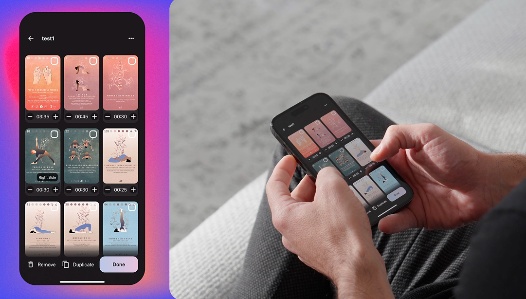 포즈를 탭하면 상세한 영상과 유용한 정보가 나와요. 교사와 수련자 모두에게 필요한 정보를 담았습니다. 다음 단계로 넘어가면 더 세밀하게 커스터마이징할 수 있어요. 포즈 순서를 바꾸거나, 각 포즈에 머무르는 시간을 조절하거나, 좌우 구분도 설정할 수 있죠. 그리고 시작을 누르면 자기가 직접 짠 개인화된 수련을 가이드에 따라 진행할 수 있습니다.