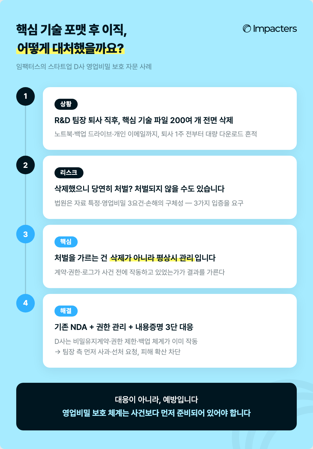 핵심을 다시 한 번 정리하자면 이렇습니다. D사가 대응에 성공한 이유는 "파일이 삭제됐다는 사실"이 아니라, 평소 비밀유지계약과 비밀관리 체계가 같이 작동하고 있었기 때문입니다. 똑같은 사건이 계약과 관리 체계 없는 회사에서 일어났다면, 법원은 "이게 무슨 영업비밀이냐"며 청구를 기각할 가능성이 열려 있었다는 뜻이기도 합니다.