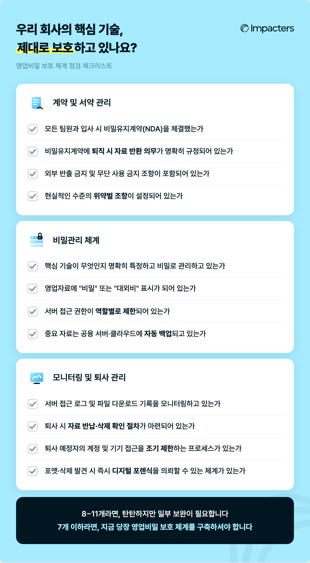 그래서 영업비밀 보호 체계는 계약·관리·모니터링 세 축으로 같이 움직여야 제대로 작동합니다. 임팩터스가 자문 현장에서 반복적으로 점검하는 항목을 한 번에 정리해드리면 다음과 같습니다.
