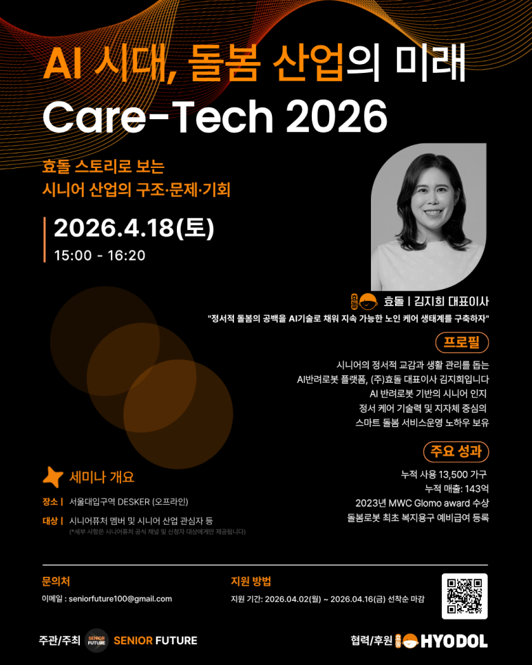 최근 시니어퓨처에서는 AI 기반 정서 돌봄 서비스 효돌의 실제 운영 사례를 중심으로 Care-Tech 세미나를 진행했습니다. 이번 세미나는 “기술이 돌봄을 어떻게 바꿀 수 있는가?”라는 질문에 대해 현실적인 답을 들을 수 있었던 자리였습니다.