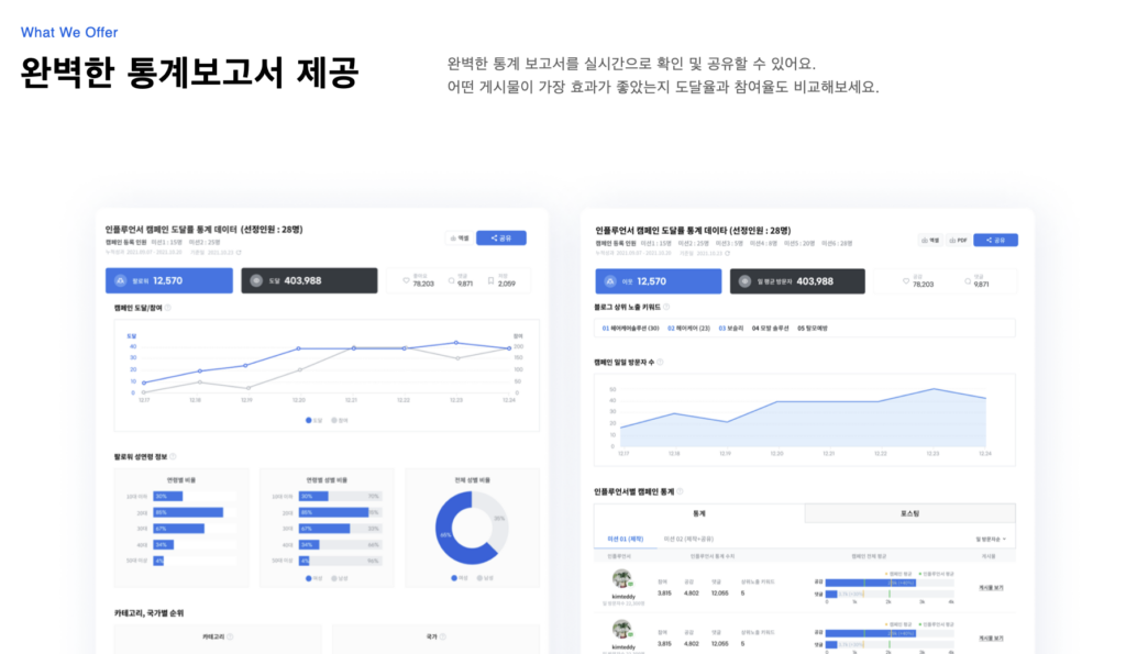 - 인플루언서 데이터 분석 및 선정 콘텐츠 이력, 인게이지먼트 분석, 채널 유형 분석 등 데이터 기반의 인플루언서 평가 기능을 통해 규제 리스크가 높은 카테고리에서도 적합한 인플루언서를 선정할 수 있는 판단 근거를 제공합니다.