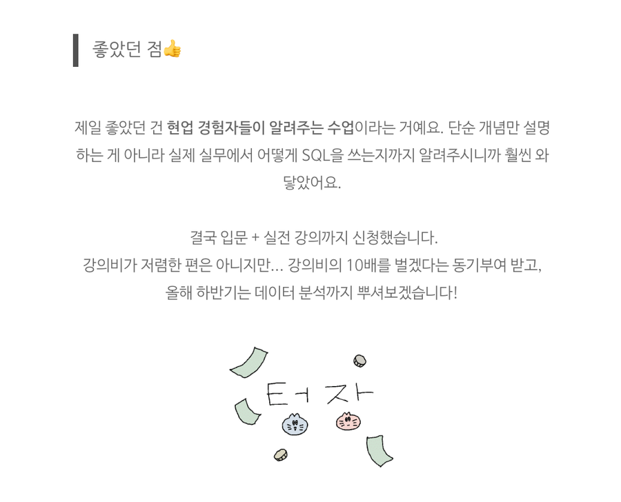 이번에 배운 내용들을 자주 복습하고, 작은 부분부터 하나씩 활용해 나간다면 곧 실무에서도 자신 있게 SQL을 쓸 수 있을 거예요. 이제 막 첫 발을 뗀 여러분의 데이터 라이프를 응원합니다!