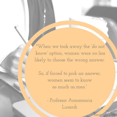'모르겠다'라는 선택지를 없앴을 때, 여성들이 오답을 고를 확률은 더 높아지지 않았습니다. 즉, 반드시 하나의 답을 선택해야 하는 상황에서는 여성도 남성만큼 정답을 잘 알고 있습니다. (출처- taramohr.com)