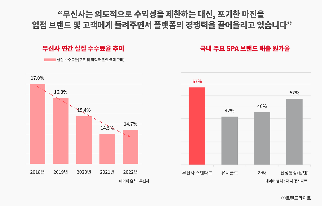 또한 무신사 스탠다드의 매출 원가율을 70% 내에서 유지하고 있는 것 역시 수익을 제한한 대신 고객을 락인시키는 전략의 일환입니다. 보통의 SPA 브랜드들은 매출 원가율을 40~50% 정도로 가져가는데요. 이보다 마진을 박하게 가져가면, 무신사가 얻는 이익은 줄어들지만, 대신 고객의 만족도는 더 올라가게 됩니다. 여기에 더해 무신사 입점 브랜드들의 기본적인 가격대보다 낮은 포지셔닝을 취하면서, 상호 경쟁으로 인한 잠식 효과도 미연에 방지 가능하고요. 이것 역시 자체 플랫폼에서 판매하기에 유통 수수료가 들지 않는 무신사 만이 할 수 있는 전략이기도 합니다.