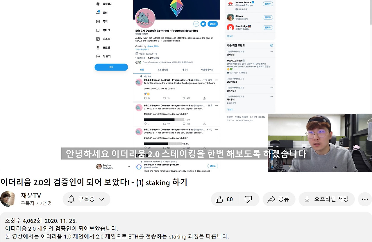 나는 디파이 썸머가 한창이던 2020년 11월에 이더리움 2.0 벨리데이터를 시작했었다. 당시 이더리움의 시장가는 약 68만원이었다. 이더리움 벨리데이터를 시작하기 위해서는 32ETH를 스테이킹*해야 했다.