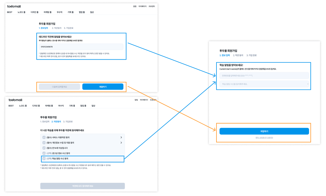 카카오 알림톡을 보내기 위해서 (1) 전화번호와 (2) 알림 수신 동의, 2가지 정보를 수집해야 한다. 둘 중에 1가지라도 부족하면, 알림을 전송할 수 없다. 그렇기에 회원가입 단계에서 전화번호와 알림 수신 동의를 모두 받고 있다. 다만, 각 정보를 수집하는 페이지가 서로 다르다는 게 문제였다. 전화번호 입력 필드는 선택 입력 정보 페이지에서, 알림 동의 체크박스는 이용 약관 페이지에 있었다.