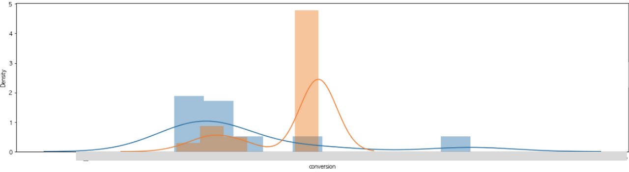 앞선 차트는 시계열 차트로, 데이터의 추세를 보는 데 용이하지만 분포를 파악하는 데 적합하지 않다. 보다 정확한 분포 구간을 확인하기 위해 일 별 전환율을 히스토그램으로 그려봤다. 히스토그램은 데이터의 빈도를 나타낸 그래프로, 차트에서 Peak가 보이는 부분이 데이터가 많이 나타 남을 뜻한다. 파란색 선은 기능 배포일 이전, 주황색 선은 기능 배포일 이후의 데이터를 뜻한다. Peak 부분을 봤을 때, 주황색 선이 파란색보다 더 높은 위치에 높게 있음을 볼 수 있다. 즉, 전환율 분포가 훨씬 개선 됐음을 보여준다.