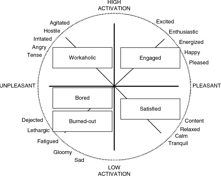 만족과 몰입은 다르며, 몰입에서 느끼는 심리적 상태는 만족과 다를 수 있습니다. Russell의 연구에 따르면, 직원들의 심리적 상태는 ‘생각이나 행동의 활성화 정도(Activation – Deactivation)’와 ‘만족감을 느끼는 정도(Pleasure – Displeasure)’에 따라 달라지며, 네 가지 분류로 정리하여 각각의 상태에 따라 발생하는 감정들을 확인할 수 있습니다.