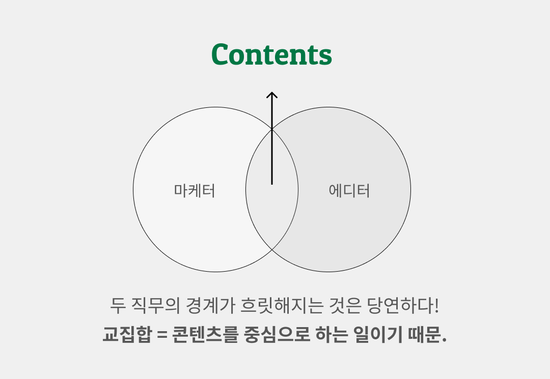그리고 이 교집합 속에서 일을 해온 저의 발자국을 저만의 '경쟁력'으로 삼아야겠다는 생각을 했습니다. 저만의 뾰족함이 콘텐츠를 마케터의 시선으로도, 에디터의 시선으로도 바라본 것에서 나올 수 있다고 생각했기 때문이에요.