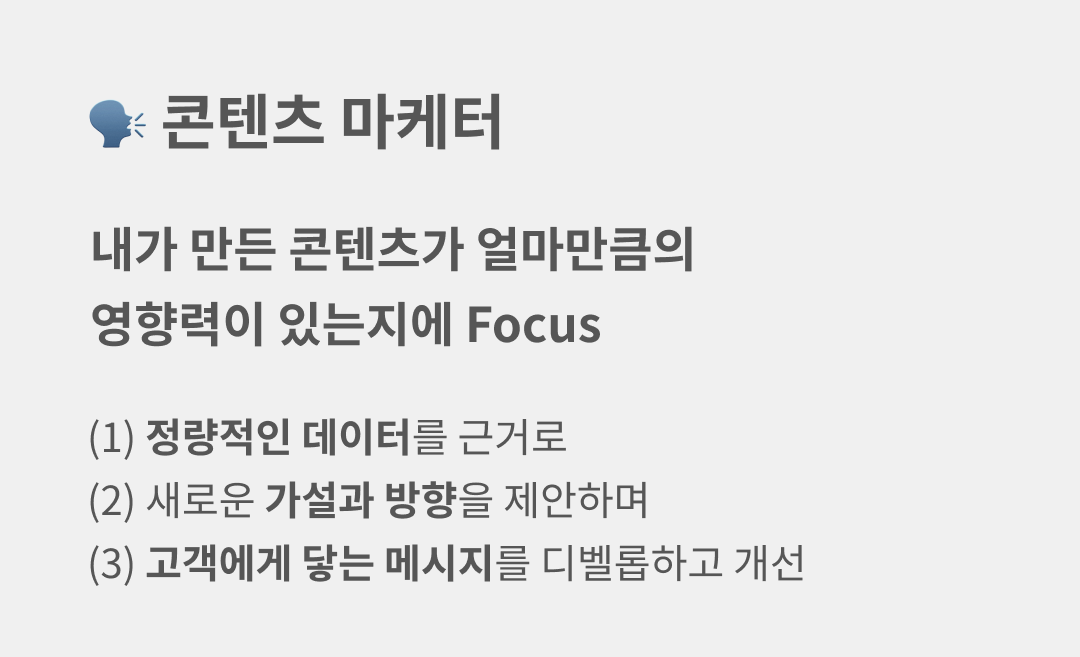 콘텐츠 마케터는 콘텐츠의 영향력, 즉 결괏값에 포커스를 맞추는 일을 합니다. 마케팅 본질은 '설득'에 있다고 생각하는데요. 콘텐츠 마케터는 여러 형태의 콘텐츠를 통해 제품이나 서비스를 고객에게 알리고, '한번 경험해 볼래~?'라고 설득하는 일을 한다고 생각해요. 그래서 내가 만든 콘텐츠가 얼마만큼의 영향력이 있는지, 기획한 캠페인을 통해 얼마나 많은 고객이 클릭을 하고 전환이 되었는지 '결과'에 대해 집중해야 한다는 것이죠.