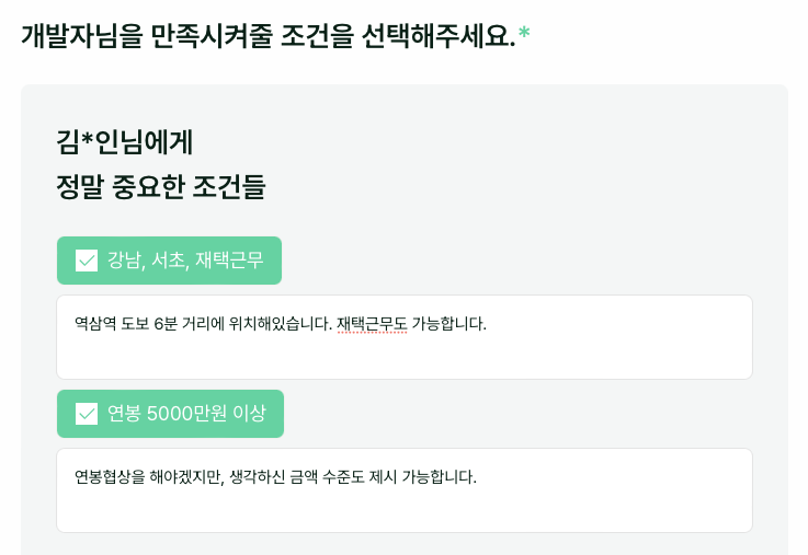 조건을 많이 선택할 수 록 개발자에게 적합한 기업이라고 표시됩니다.