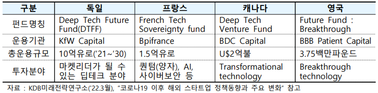 2020년 딥테크 총 투자액의 75%가 미국에 집중되었는데요. 유럽권 국가들도 딥테크 육성에 적극 참여하고 있습니다. 프랑스는 딥테크 육성을 위한 ‘Deep Tech Plan’을 내세웠고, 영국, 프랑스, 독일, 캐나다도 정책금융기관을 활용하여 딥테크 전문 펀드를 결성하고 있습니다.