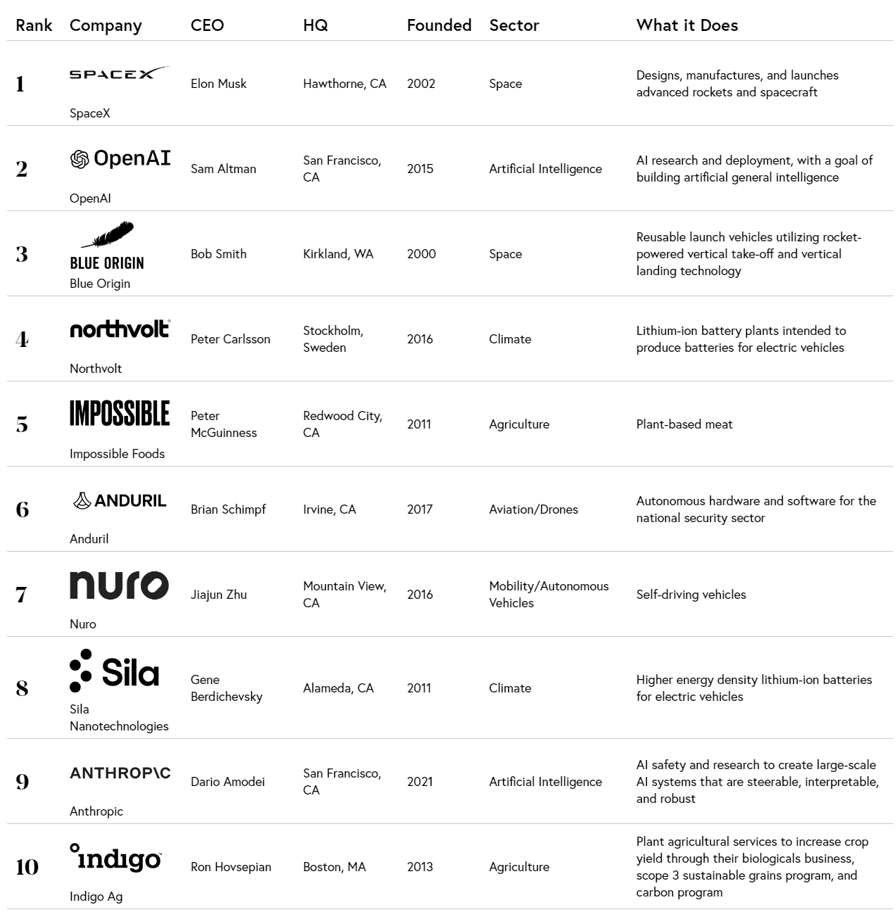 SpaceX와 OpenAI가 역시 1, 2위를 차지했습니다. SpaceX는 2002년에 설립되었지만 2021년에서야 최초 민간 유인우주선 발사에 성공하며 큰 화제가 된 바 있습니다. OpenAI 역시 2015년에 설립되었으나 숨죽이며 고독한 연구개발 시기를 보낸 끝에 진일보한 생성형 인공지능 챗GPT 모델을 작년 말 출시했고 단숨에 수십조원에 달하는 기업가치를 평가받고 있습니다.