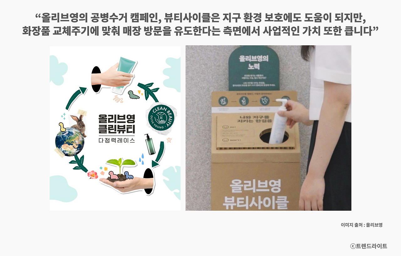 물론 이와 같은 공병수거는 분명 의미 있지만 엄연히 비용이 발생하는 활동입니다. 하지만 동시에 올리브영 실적에도 도움이 되는 활동이기도 한데요. 공병을 제출하려면 당연히 올리브영 매장을 방문해야 하고, 방문한 고객들은 자연스레 구매까지 이어지는 경우가 많습니다. 실제로 올리브영 오늘드림 픽업 서비스를 이용하는 경우, 단지 주문한 상품을 가져가는 걸 넘어서 추가 구매로 이어지는 비율이 상당하다고 하는데요. 공병이 있는 경우, 화장품 교체가 필요한 상황이니 더욱 이러한 확률은 높아지겠죠? 뷰티사이클 캠페인이 결과적으론 올리브영의 실적에도 도움이 되는 선순환을 만들어내는 셈입니다.