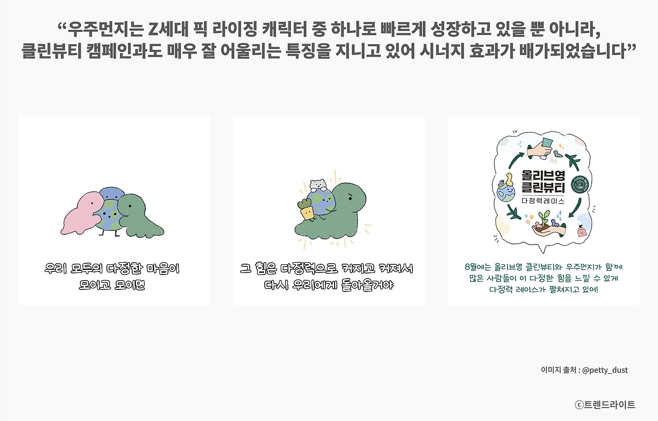 우리는 귀여워야 대접받는 시대에 살고 있습니다. 무려 675만 명이 찾았다는 벨리곰부터, 에버랜드 유튜브 계정을 혼자 먹여 살리고 있다는 푸바오까지, 귀여운 마스코트의 존재 유무가 브랜드의 성패를 좌우하기까지 합니다. 이번 클린뷰티 다정력레이스도 당연히 이러한 트렌드를 놓치지 않고, 우주먼지 캐릭터와 콜라보를 진행했습니다.
