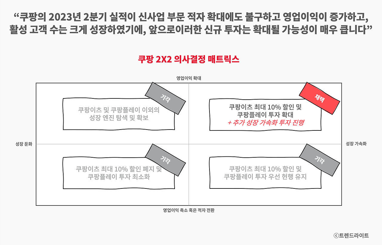 그러나 작년 3,4분기 연속 흑자를 기록한 이후, 쿠팡은 드디어 결단을 내립니다. 정체된 활성 고객 수 반등을 위해 로켓와우 멤버십 고객 대상으로 쿠팡이츠 최대 10% 할인 혜택을 제공하기 시작한 겁니다. 효과는 대단했습니다. 작년 4분기 1%에 불과했던 전년 대비 활성 고객 증가율이, 올해 1분기 5%, 2분기에는 무려 10%로 가속화되었거든요. 여기에는 추가적인 콘텐츠 투자를 통한 쿠팡플레이의 성장도 한몫하기도 했습니다. 물론 이로 인해, 쿠팡의 신사업 부문의 조정 EBITDA 기준 적자는 올해 2분기 전년 대비 2.4배나 증가합니다. 중요한 건, 그럼에도 불구하고 쿠팡의 올해 2분기 영업이익은 사상 최대 규모를 기록했다는 점입니다. 즉 쿠팡은 성장에 돈을 더 쓰더라도, 흑자를 유지하는 건 물론 이익 규모를 키울 수 있다는 확신을 얻게 되었습니다. 따라서 앞으로 쿠팡은 돈을 더 쏟아부을 가능성이 커졌습니다.