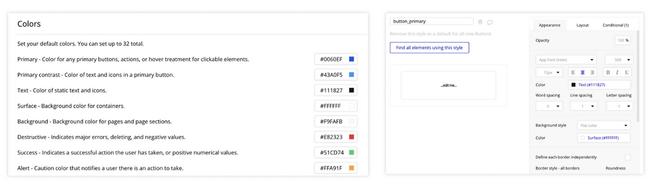 버블의 디자인 시스템으로 (1) 컬러 스타일과 (2) 컴포넌트 스타일이 있습니다. 여기에 한 번 등록한 설정 값은 작업하는 도중에 바로 불러와 적용할 수 있습니다. 반복적으로 사용하는 설정 값은 매번 입력할 필요 없이 불러오기만 하면 됩니다. 전체적인 디자인을 변경해야 하는 경우, 디자인 시스템 자체를 바꾸면 모든 컴포넌트에 일괄 적용되기에 유지 보수에도 편리합니다. 디자인 키트에서 사용한 컬러 시스템의 헥사 코드를 그대로 등록하고, UI를 만들 때 사용한 컴포넌트도 스타일 값으로 등록했습니다.