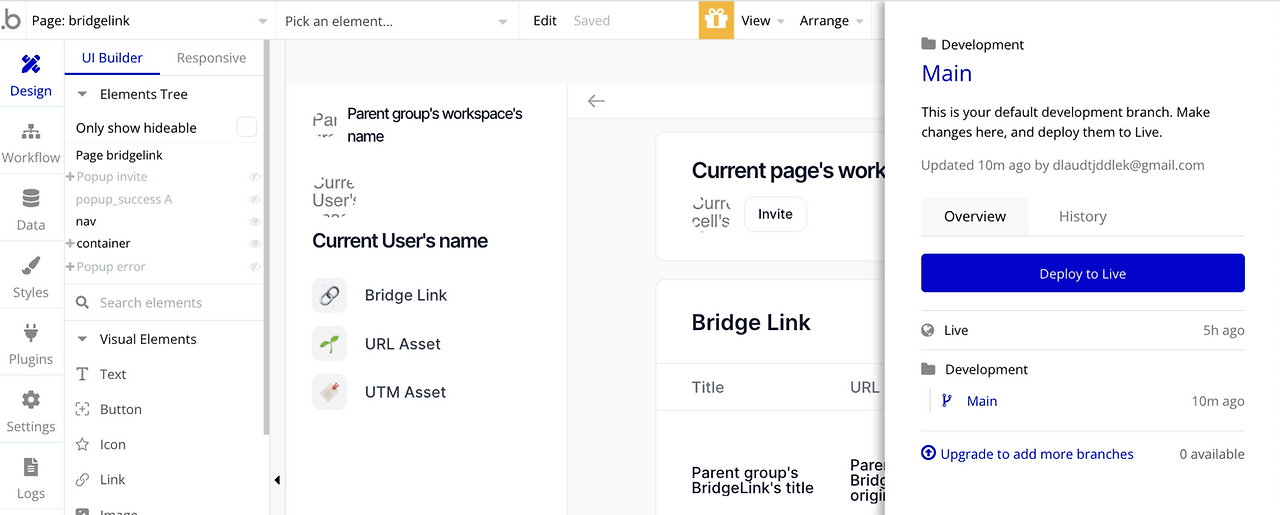 모든 세팅을 완료하고, 최종적으로 서비스를 배포했습니다. 버블은 유료 플랜에서 Dev와 Live 버전 서비스를 지원합니다. 이 둘은 독립적으로 존재하며, Dev는 개발용이고 Live는 유저용 서비스라 보면 됩니다. 버블에서 작업한 부분은 실시간으로 Dev에 반영됩니다. 작업을 완료한 Dev 버전을 배포하면, 그제야 Live 버전에 적용됩니다.