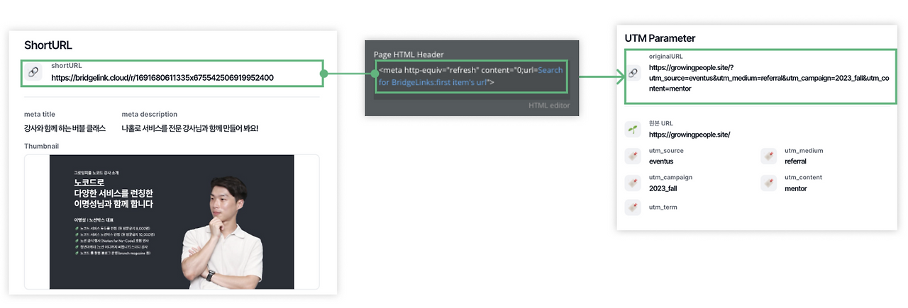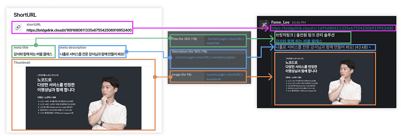 그다음으로 페이지의 Title, Description과 Thumbnail Img를 유저가 설정한 데이터를 불러와 설정되게 만들었습니다. 이제 카카오, 슬랙 등의 채널에서 shortURL 링크를 공유했을 때, 설정한 값이 유저에게 보입니다.