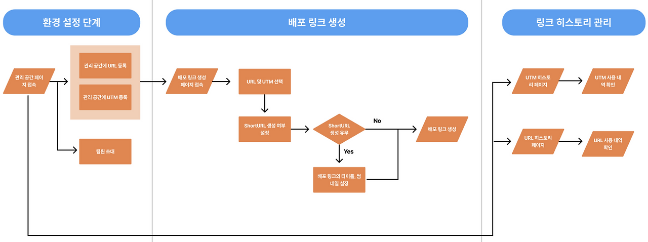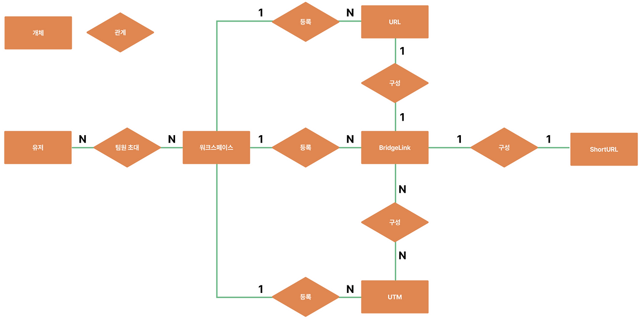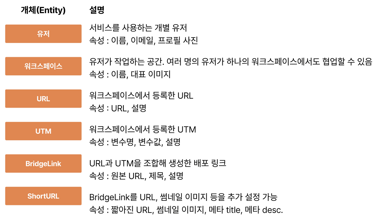 브릿지링크의 플로우 차트를 참고해 어떤 개체가 필요한지 정의했습니다. 전반적인 서비스 프로세스는 (1) 업무 공간에 여러 팀원을 초대하고 (2) 공간에서 URL과 UTM을 등록하며 (3) 배포 링크를 생성합니다. 이때, 필요한 경우에 (4) ShortURL을 생성하고 썸네일 등을 별도 설정합니다.
