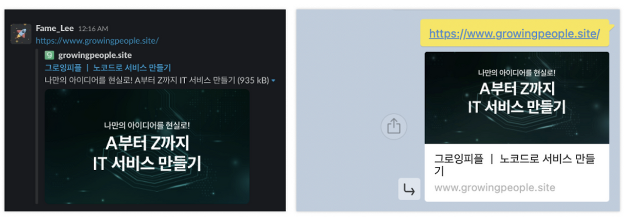 초기에 서비스를 홍보할 때, 커뮤니티나 주변 지인에게 링크를 공유하는 방식을 사용합니다. 이때, 채널에서 자동으로 링크에 저장된 썸네일, 타이틀, 디스크립션 값을 불러와서 보여줍니다. 썸네일 이미지와 문구가 얼마나 매력적인지에 따라서 유저의 클릭율도 달라집니다.