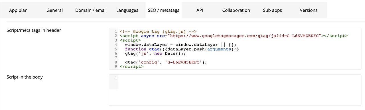이제 서비스 제작이 완료됐으니, 배포를 준비할 차례입니다. 유저들이 서비스를 어떻게 사용하는지 파악하기 위해 GA를 연결했습니다. 버블의 설정 페이지에서 현재 서비스를 구성하는 모든 페이지의 <Head>와 <body>에 코드를 삽입할 수 있습니다. 여기에 생성한 GA 계정의 트래킹 코드를 삽입하면 됩니다.