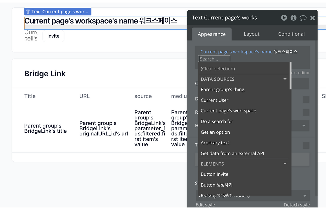 텍스트, 이미지 등의 요소로 데이터베이스에 저장된 데이터를 불러올 때, Dynamic data 기능을 사용합니다. 이는 현재 페이지, 데이터베이스, 유저 정보 등을 변수 값으로 활용할 수 있는 기능으로, 사용한 변수 값은 파란색 글씨로 표기됩니다. 아래에 적힌 Current page’s workspace’name는 현재 페이지와 관련된 워크스페이스 데이터에서 name 값을 불러옴을 뜻합니다. 이런 식으로 모든 요소에 필요한 데이터를 호출했습니다.