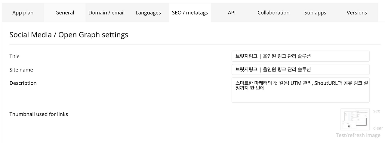 설정 페이지에서 링크 공유 시 보여주는 기본 값을 설정할 수 있습니다. 썸네일 이미지로 서비스의 핵심 기능을 담은 목업을 설정하고, 타이틀에는 서비스 이름을, 디스크립션에는 서비스의 제공 기능을 요약해서 적었습니다.