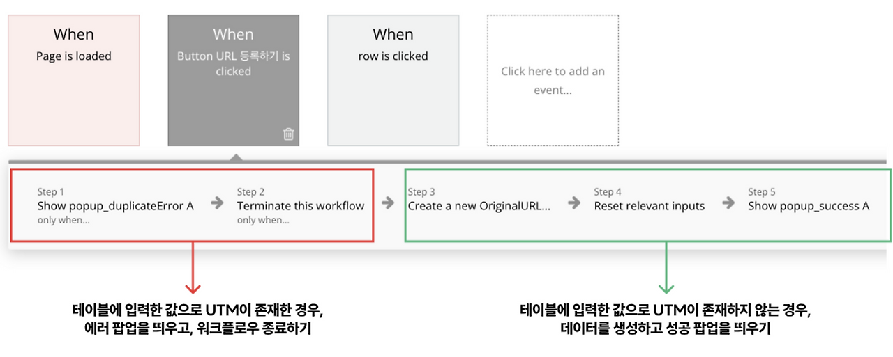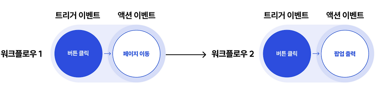 앞선 예시에서는 동일한 버튼을 클릭했지만, 조건에 따라 다른 결과가 나왔습니다. 바꿔 말해, 트리거 이벤트는 동일하지만, 액션 이벤트만 다릅니다. 이런 경우에 하나의 워크플로우 안에 조건 별 액션 이벤트를 따로 설정하면 됩니다.