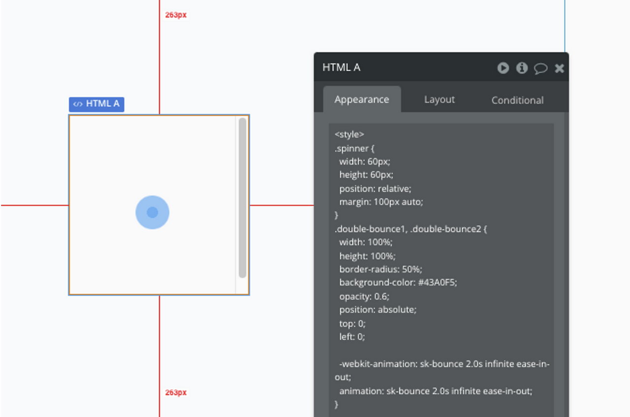 우선 Short URL을 클릭했을 때 나오는 빈 페이지를 생성했습니다. 그리고, 혹시 인터넷 문제로 리다이렉트가 지연될 경우에 유저에게 로딩 중이란 느낌을 줄 수 있도록, HTML 코드를 활용해 애니메이션 요소를 직접 생성했습니다. 버블의 기본 요소 중에 HTML 요소가 있는데, HTML 코드를 직접 입력해 요소를 생성할 수 있습니다.