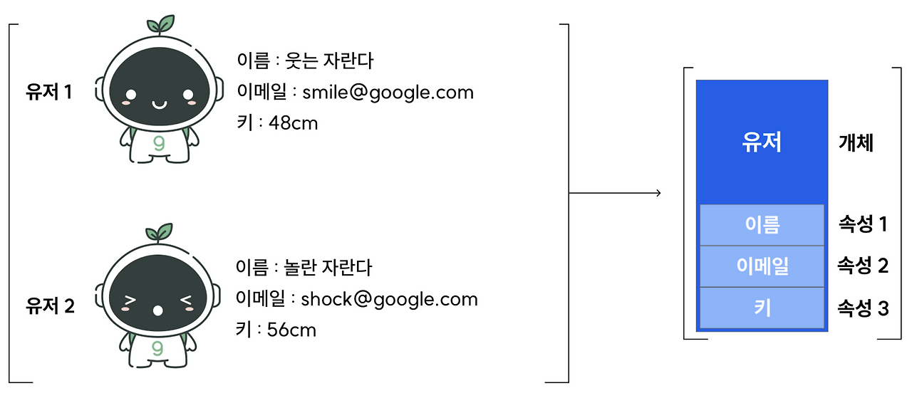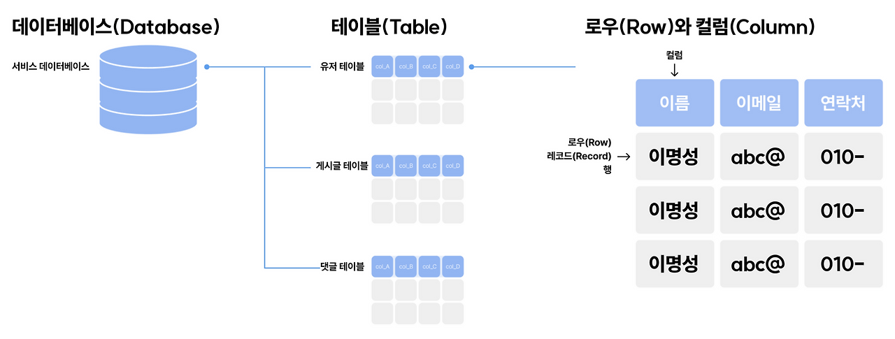 여기서 개체(entity)는 ‘정의 가능한 사물 또는 개념’으로, 데이터베이스에서 테이블(table)로 대변됩니다. 속성(attribute)은 ‘개체가 갖고 있는 정보의 유형’으로, 테이블의 컬럼(column)으로 대변됩니다.