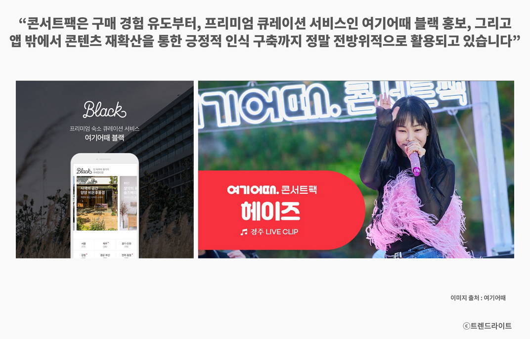 이러한 과정에서 여기어때가 광고만큼이나 신경 썼던 건, 바로 '콘텐츠'입니다. 여기어때는 브랜드 방향성을 재설정하는 과정 속에서 경쟁사도 새롭게 정의했는데요. 여기어때는 같은 산업의 브랜드가 아닌, 넷플릭스 같은 OTT 서비스, 배달앱 등, '집에 오래 머무르게 하는 브랜드'를 가장 경계할 대상으로 뽑았다고 합니다. 그래서 여행과 '밖에서 즐기는 여가'의 소중함을 고객에게 인식시키는 것이 무엇보다 중요하다고 봤고요. 이를 위해 여기어때가 만들고 싶은 '즐겁고 특별한 경험'이 무엇일까에 대해 고민하며, 오리지널 콘텐츠 만들기에 직접 나서게 되었다고 합니다. 더 많은 고객이 여행을 떠나게 만들려면, 즐거운 경험을 줄 수 있는 콘텐츠가 필요한데, 막상 시장에 딱 맞는 것이 없었던 겁니다. 그래서 과감하게 투자를 하여 직접 여기어때팩이나 여기어때투어 같은 콘텐츠 개발에 나섰고요. 여기서 가장 성공적인 프로젝트가 바로 여기어때 콘서트팩이었습니다.
