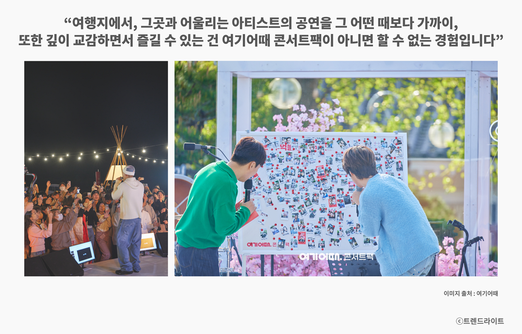 그리고 특별한 경험을 위한 여기어때의 도전은 콘서트팩에만 국한되어 있지 않습니다. 앞서 말씀드린 것처럼 여기어때팩뿐 아니라 여기어때투어라는 이름으로 다양한 여행 콘텐츠 개발에도 나서고 있고요. 어쩌면 콘서트팩 역시 이전부터 여기어때 라이브나 플레이리스트 콘텐츠를 만들던 경험이 있었기에 가능했던 프로젝트였습니다. 그간의 노력이 쌓여 더 발전된 결과물이 나왔던 겁니다.