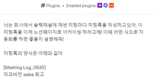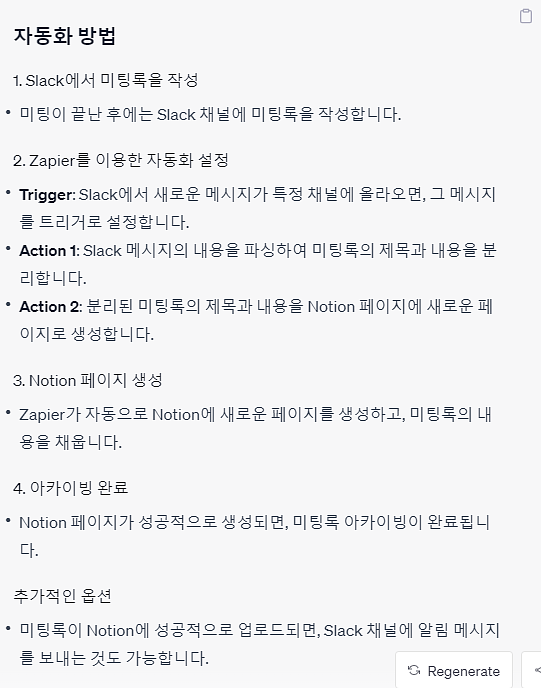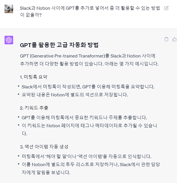 이제 ‘미팅록 자동정리’을 이야기해 보고자 합니다. 저희는 미팅 진행 시 빠르게 내용을 정리해서 슬랙의 채널에 업로드합니다. 다만, 미팅의 내용이 많아지다 보니, 이를 노션으로 아카이빙 하고자 하는 니즈가 발생했어요! 이제, 위 상황을 구체적으로 GPT에게 설명하고, 자동화 방법을 물어보면 됩니다. 아래와 같이 대충 상황만 물어봐도 자세히 답변해 줍니다.