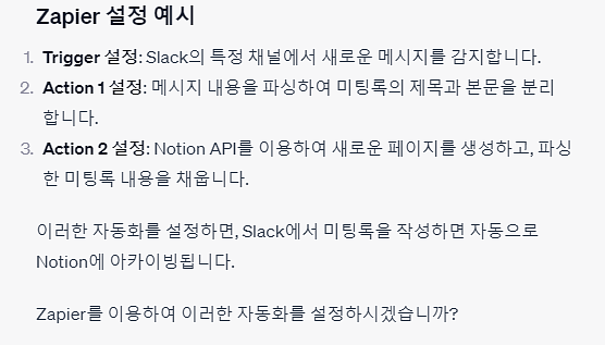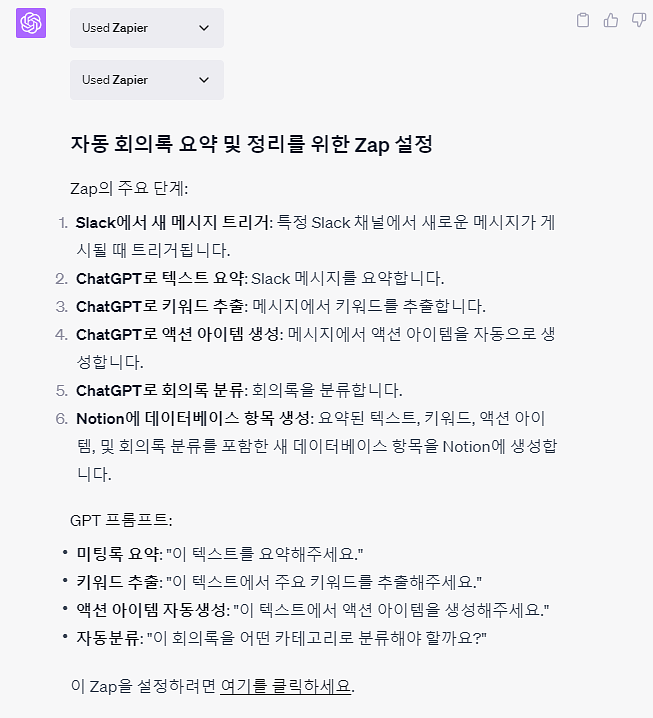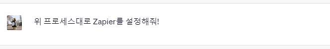 다음과 같은 방식으로 대략적인 자동화 방법뿐만 아니라, Zapier를 설정하는 방식까지 말해줍니다. 다음은 ChatGPT 답변이에요!