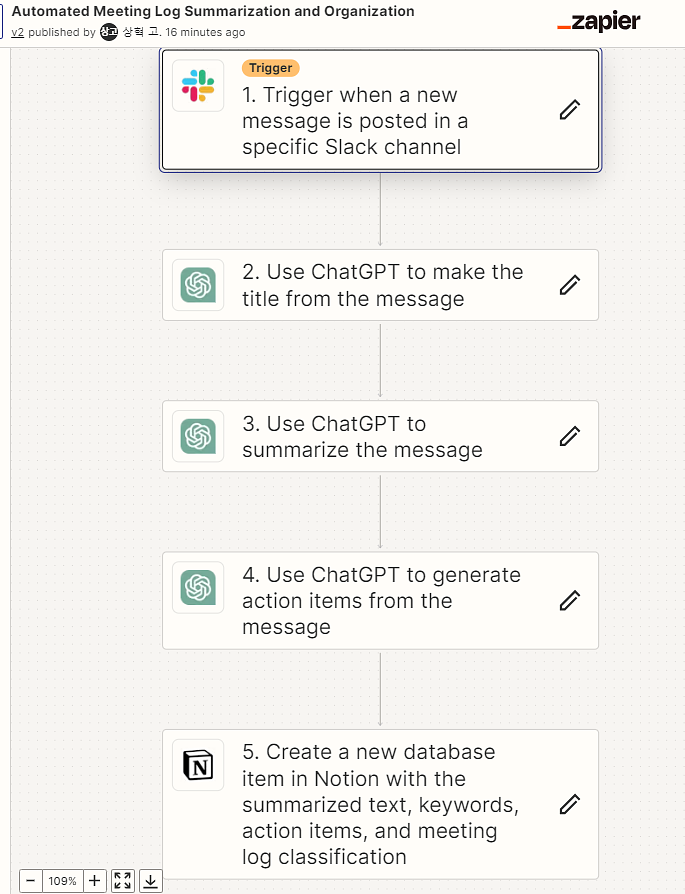 하지만 여기서부터 각 세부조건을 설정해야 합니다. 처음 작업 시에는 각 업무 툴 별로 연결까지 해야 하니 작업이 쉽지 않아요! 그렇지만 하나씩 연결하면 완성이 됩니다. 다음은 각 단계별로 작업한 예시입니다. Zap Share Link 해당 링크를 클릭하시면 이미 설정된 Zap을 이용하실 수 있습니다.